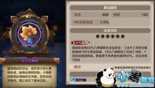 普通攻击有60%几率替换为法宝攻击:【法术】对敌方横排造成100%攻击伤害,15%几率附加【灼烧】状态,1回合后造成伤害,数值等于其承受伤害的60%。法宝冷却1回合