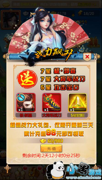 至尊礼包:开服前三天可购买,7星极武将、7星装备、5星攻击宝石,仅需98元,还可以提升VIP等级,还能领取许多额外的奖励,小编推荐五颗星。