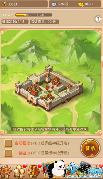 领地:领地征收能获得经验、银两以及其他的道具奖励。等级越高征收次数也越多,每五分钟恢复一次征收次数,当征收次数满了以后将不在累积,此外还可以购买征收药水,一个征收药水可以增加十次征收机会,然后VIP等级越高,可购买的征收药水也越多。不缺钱的主公,可以尝试这个方法。
