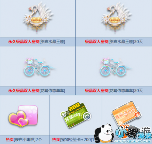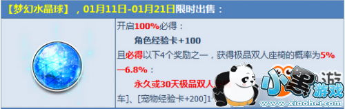 100%得角色经验卡+100,且必得永久或30天极品双人座椅【骆宾水晶王座】/【花晴依恋单车】、【宠物经验卡+200】1个、【表白小喇叭】2个等4个奖励之一