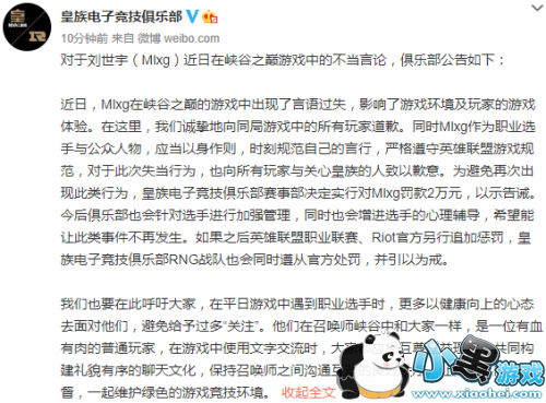 近日,Mlxg在峡谷之巅的游戏中出现了言语过失,影响了游戏环境及玩家的游戏体验。在这里,我们诚挚地向同局游戏中的所有玩家道歉。同时Mlxg作为职业选手与公众人物,应当以身作则,时刻规范自己的言行,严格遵守英雄联盟游戏规范,对于此次失当行为,也向所有玩家与关心皇族的人致以歉意。为避免再次出现此类行为,皇族电子竞技俱乐部赛事部决定实行对Mlxg罚款2万元,以示告诫。今后俱乐部也会针对选手进行加强管理,同时也会增进选手的心理辅导,希望能让此类事件不再发生。如果之后英雄联盟职业联赛、Riot官方另行追加惩罚,皇族电子竞技俱乐部RNG战队也会同时遵从官方处罚,并引以为戒。