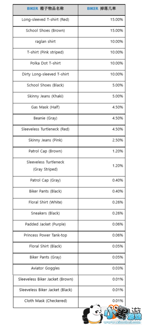 以下表格显示了新免费/付费箱子包含物品的掉落几率(显示至小数点后两位)