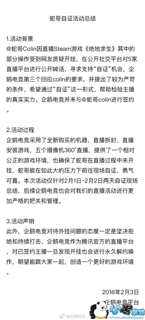 而就在今日凌晨2时13分,腾讯直播平台官方微博@企鹅电竞发表《蛇哥线下自证活动总结》,该总结从"活动背景"、"活动过程"以及"活动声明"对蛇哥线下自证做了简单的解释与总结,但是并没有说到蛇哥的自证结果。只是单纯地表述出“蛇哥线下自证时没有开挂”这一观点,蛇哥以前的直播是否开挂依旧是一个谜团。