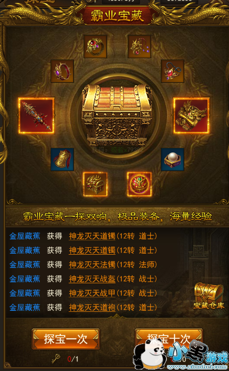 通过探宝有几率获得霸业神剑神甲、各职业极品装备、大量材料等珍稀道具。