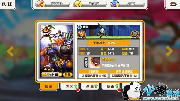 英雄优点:防御性伙伴暴击增加,用竹子编制的盾牌可以抵挡大范围敌人的攻击,并且进阶后每隔一段时间将会自动恢复生命,肉到让人害怕~
