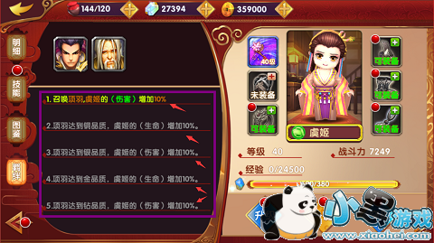 以虞姬MM为例,点开虞姬MM的羁绊界面,在上方出现了两个英雄的头像,分别是项羽以及范增,下方则显示了虞姬的羁绊加成,总的来说就是项羽以及范增的卡牌品质越高,对于虞姬的属性加成也就越高。