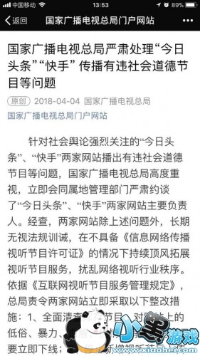 4月4日消息,国家广播电视总局门户网站微信公号发布消息称,针对社会舆论强烈关注的“今日头条”、“快手”两家网站播出有违社会道德节目等问题,国家广播电视总局高度重视,立即会同属地管理部门严肃约谈了“今日头条”、“快手”两家网站主要负责人。