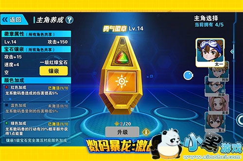 谁还没有想当主角的心呢?就让《数码暴龙:激战》为数码迷们量身打造的主角系统来满足你吧!只需要消耗一定量的主角徽章就可以进行主角解锁和升级,解锁后就会获得该主角的形象。玩家可以根据自己的喜好自行选择形象,而升级则带来的是战斗力的变化,徽章等级达到相关要求之后就可以获得主角技能、增加能量格、解锁宝石镶嵌等诸多提高战力的有利因素,帮助各位玩家迅速与对手拉开差距。