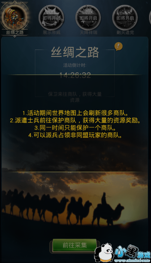 占领商队可以获得大量资源,但是活动时间有限制,勇士们需要在有限的时间内尽量多用部队去占领,占领越久,获得的资源越多,直到此商队的剩余物质为零。商队物质没有可采集的话,勇士们可以换个商队继续占领采集,采集需要的条件是队列和士兵,不需要体力,而且不限次数,只要勇士们拥有大量的士兵,就可以获得大量资源。每个商队采集有可派士兵上限,尽量派发足够的士兵,士兵越多采集的资源也是越多,勇士们可以在最短的时间内采集完这个商队,然后再开启下个商队的采集。