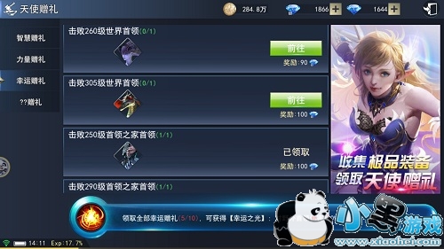在《天使圣域》开服活动“天使赠礼”中可以看到,完成智慧赠礼和力量赠礼这两个技能之后,即可挑战幸运赠礼这一任务。任务要求击败10个不同等级的世界首领,完成后即可解锁幸运之光。