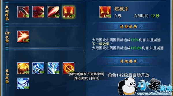 炼狱杀:大范围攻击,对周围目标造成百分比伤害,并且减速对方,冷却时间12秒。