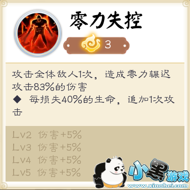 攻击全体敌人1次,造成零力辗迟攻击83%的伤害。每损失40%生命,追加一次攻击。