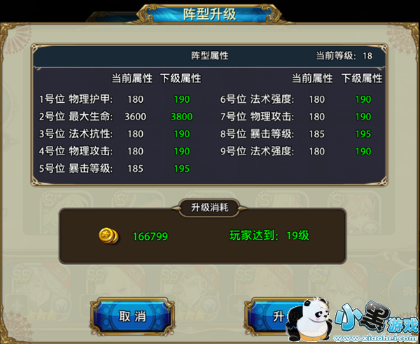 通过消耗金币,可将阵型升级会大大加强阵位所加属性。