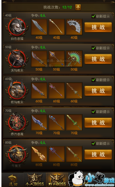 玩家到达不同等级,可以挑战相应等级BOSS,等级越高,BOSS越强,奖励越丰厚