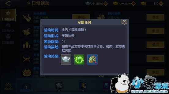 军盟任务需要加入军盟才可完成,每周可以完成100次,完成不仅可以获得大量的军盟贡献为军盟建设添砖加瓦,还可以获得上千万的银两用于强化装备提高战力。