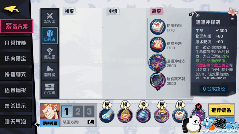 喵喵冲锋衣在生命低于30%时触发,为上路增添20%最大生命值的护盾,大幅度提高存活率。