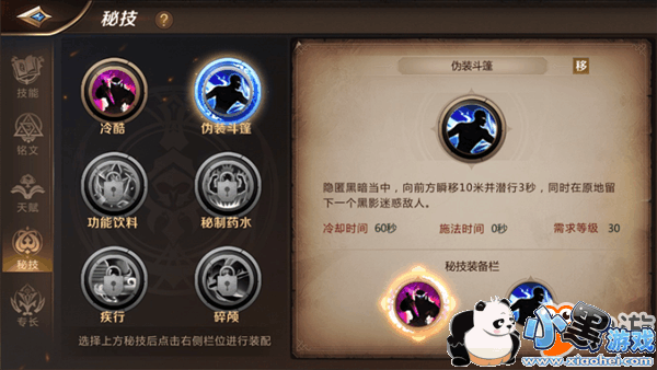 每个职业都拥有6个秘技可供玩家选择,不同的秘技达到相对应的等级就能够开启,玩家可以同时选择两个秘技进行携带,以供战斗时使用,当然了这个秘技也是可以更换的,在技能页面或者战斗页面中就能够直接进行其他秘技替换。不同的秘技效果也是不同的,就像今天要介绍的“伪装斗篷”他的效果就是能够瞬间隐匿黑暗当中,并在释放之后向前方瞬移10米之后潜行三秒,同时还会在原地留下一个黑影迷惑大家。每次技能释放后都需要冷却60秒。