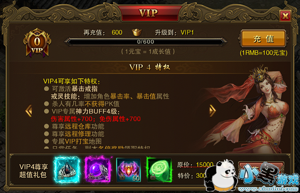 VIP礼包可获得游戏内绝版戒灵,戒灵可增加角色各种特殊属性或效果。