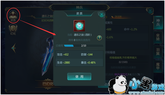 玩家可以随时选择更换展示自己已经获得的神兵形象。同时神兵也可以进行资质的培养,直接使用道具来增加神兵当前的属性。