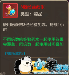 2倍经验药水,使用后获得2倍经验加成,每使用一瓶持续1小时,不同倍数的经验药水一起使用效果会覆盖,同倍数一起使用时间叠加。