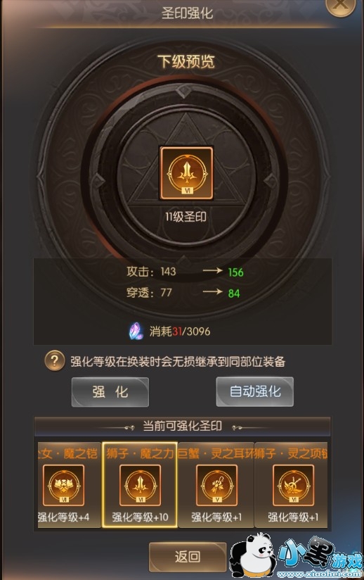 同样圣印也有高低之分,越高阶的圣印属性越好,对战力的提升也越好;多余或不用的圣印则可通过分解形成【精魄】,【精魄】则作为圣印强化的材料,强化等级在换装时会无损继承到同部位的装备。