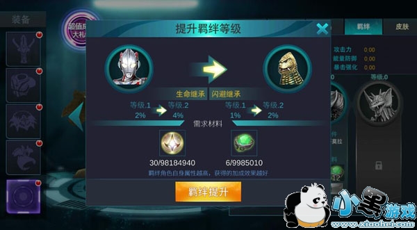 皮肤系统在《奥特曼传奇英雄》之中绝不只是好看而已,而是有着强大属性加成存在,小伙伴们的英雄穿上什么样品质的英雄皮肤就可以提升为什么档次,并且皮肤的存在还能够对英雄的主动技能进行替换!