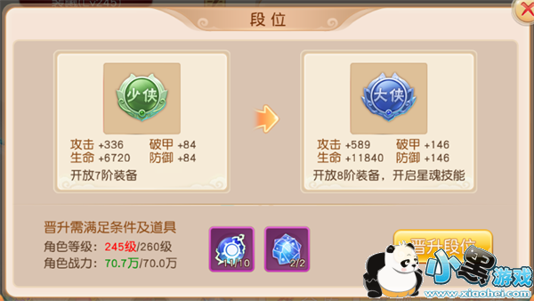 段位晋升可以提高战斗力,开放更高阶的装备,达到大侠段位还可以开启星魂技能