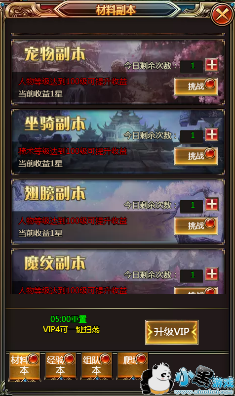 材料副本分为宝玉副本,宠物副本,坐骑副本,翅膀副本,魔纹副本。