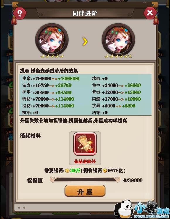 进阶到不同的星级需要的进阶材料不同,进阶失败会增加祝福值,祝福值越高升星成功的概率会越高。