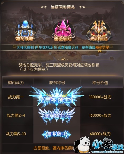 战力排名第一的将获得领主称号,称号战力180000+;战力第2-4名获得骑士长称号,称号战力160000+;战力第5-10名获得骑士称号,称号战力60000+。每位玩家头顶上的称号都将代表着联盟的荣耀,别人远远看见也会避让三分。为了游戏内的公平,每小时刷新的战力将减去领地称号与免伤守护带来的战力加成。同时战神们也要注意开服第7天晚上最终结算前要盯紧排行榜,切忌放松警惕被别人赶上,抢走了称号。