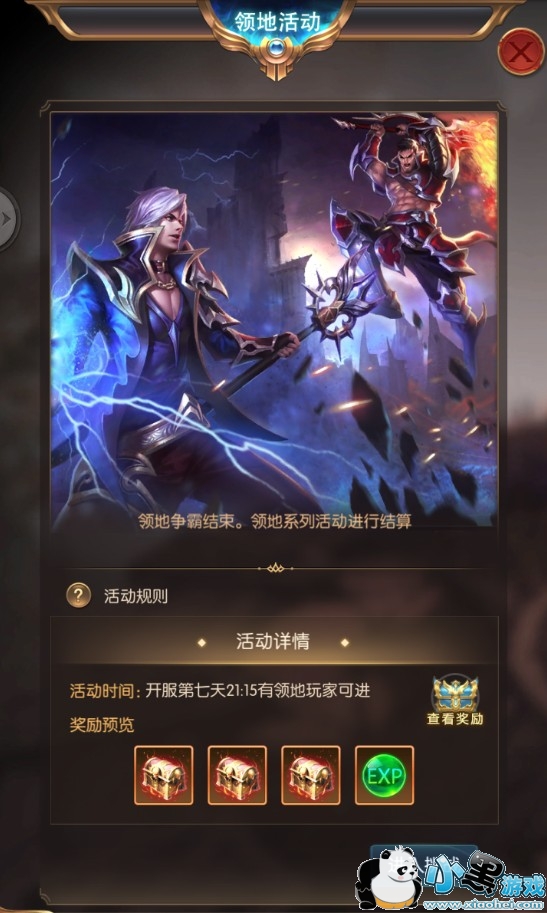 开服第7天晚21:15开启,3个占领领地的联盟成员可进入领地争霸战场,击杀敌对成员和怪物可获得积分,最终分别按照联盟总积分排名和个人积分排名获得稀有圣印奖励和大量经验奖励;