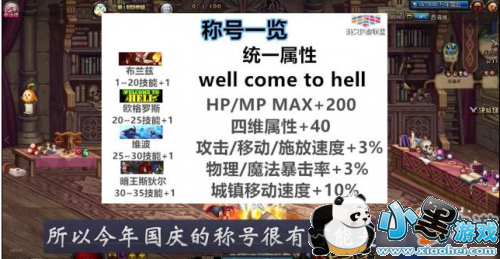 紧接着我们来看看称号的属性,往年的十一称号属性都是黄字或者暴击伤害, 但是由于两年已经没有出CD称号了,所以今年国庆的称号很有可能是减CD的