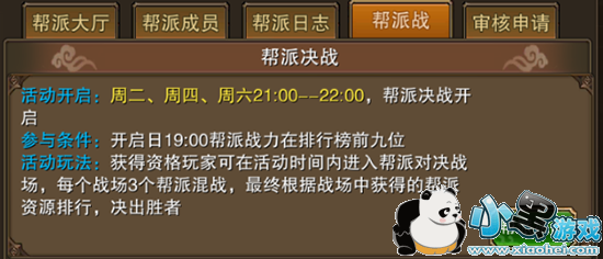 1.帮派决战每周二、周四、周六开启,规定截止时间时,帮派战力排行前9的帮派获得参赛资格(若少于3个帮派,活动本周不开启)。