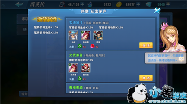 群英传玩法是通过收集武将和羁绊石激活武将间的羁绊的一个收集类玩法,羁绊激活后可获得大量的属性。不仅武将与武将之间有羁绊,更涵盖了各类兵种,使之更为丰富,可玩性更高。