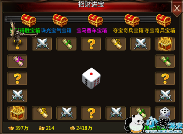 玩家等级达到50级可以进入招财进宝。前15次是免费的,之后可以花费元宝或绑定元宝增加次数,其中绑定元宝每天最多可以增加5次。每投掷1次骰子,玩家就会前进一步,会随即触发一个主题事件,有可能是任务,也有可能是宝藏。达到终点之后将会获得宝藏奖励。