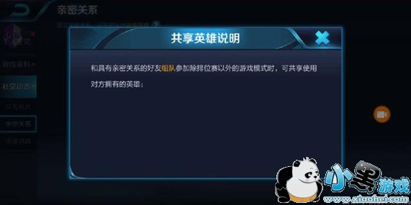 当然也有一定的限制条件,那就是好友必须有亲密关系。也就是说“恋人”“基友” ”闺蜜“等。其实有亲密关系很简单,只需要亲密值达到100即可建立。而亲密度达到100需要很短的时间即可。另外,共享英雄功能不能在排位当中使用,毕竟在排位中使用很容易坑人。