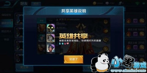 这个功能就是英雄共享。其实很好理解,就是当你跟好友组队的时候,你可以玩好友的所有英雄,而好友也可以选你的英雄,无论你是否拥有这个英雄。而且英雄还没有任何的限制,没有直售和非卖的限制。也就是说,只要你可以玩好友所有英雄,如果你的好友有武则天和艾琳,岂不是爽翻了!