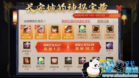 长安城的神秘宝藏活动中购买红蓝对决,获得红宝石奖励。红宝石消耗,可以参与长安城的神秘宝藏抽奖。有机会抽到4款限定皮肤,还有头像框、改名卡、积分、回城特效、皮肤碎片、英雄碎片等奖励。