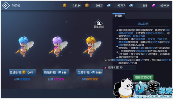 宝宝也可进行成长,成长材料可从宝宝试练地图击杀BOSS获得;所拥有的宝宝全部达到四阶才能再次祈福;