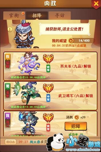 相信小伙伴都玩了一会儿了,都知道武将的选择是快速提升战力、攻占天下的关键因素。当然其中也是有些少量稀有武将,根本很难通过平常的获取途径获取到,那么这边就给大家透露一个小玩法,在内政界面,招降系统可以招降到一些特殊的武将哟!那么招降所需要的威望值哪里获取呢?首先,每攻下一个郡县就会获得一定的威望值。其次,好友之间可以互相赠送,那么快去加更多的好友,提升威望值!