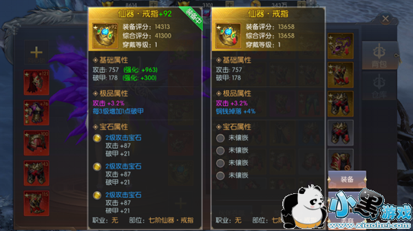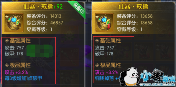 细心的玩家一定发现评分值有两个,一个是装备评分,一个是综合评分,下面就来给大家介绍一下他们的区别,装备评分是装备评定基础值,评定的是装备的基础属性和极品属性,而综合评分包含了宝石、洗练、强化等多种加成后的属性评定,这些加成都会在换装备时转移,所有当装备评分相同或接近时主要看极品属性,看情况选择需要的属性装备。