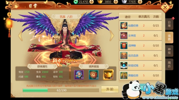 参加日常活动,还可以获取真元,使用真元提升修炼境界,可以极大提升战力属性。