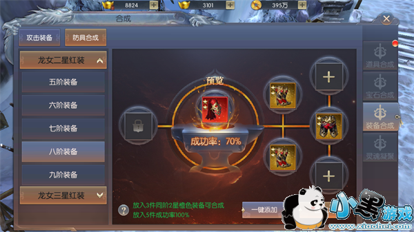 与攻击装备合成不同,防具的合成就相对容易了些,只需放入同星同阶的橙色装备就可以合成,对装备的部位并没有特别限制,即鞋子+裤子也可以合成出头盔,所以在防具合成中的组合就多了很多。