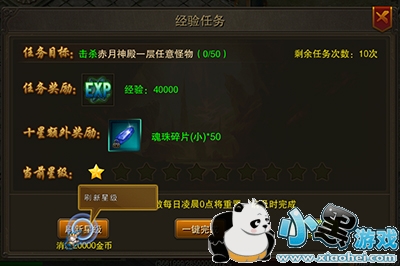 经验任务为简单的杀怪任务,只要消灭指定怪物就可以快速完成啦。接取任务前,只要花费少许金币就可以刷新任务星级,星级越高,完成任务可以获得的奖励就越多,建议各个玩家最好刷新任务为满星后再接取。
