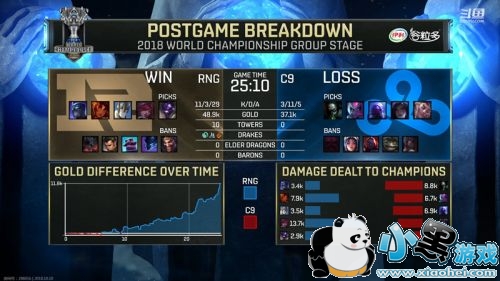 比赛开始,前期来到RNG的熟悉的节奏,岩雀游走到下路配合RNG 的下路组合率先拿下一血。此后RNG的下路组合开始展现出他们的绝对压制力,两度对位单杀,并及早拿掉了一血塔。此后霞的推塔节奏无人能挡,虽然C9的上单厄加特凭借自己的精湛操作多次打出了优势,但是面对一个装备过早成型的霞,在正面团战难以抵挡。最后RNG凭借绝对的装备碾压,推掉对方的水晶,拿下本场比赛胜利。恭喜RNG。