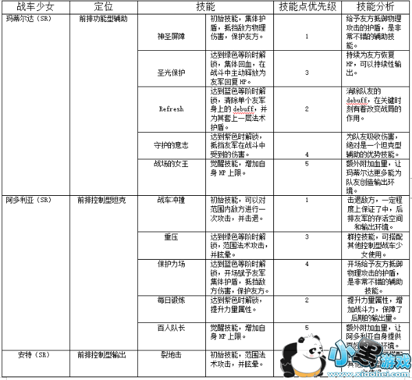 以下对于目前能获取到的力量型战车少女技能的分析,可以用来作参考,将会随后时间进行更新,实际上战车少女技能提升方式还需要根据队伍的配置来定。不同的阵容,战车少女在技能搭配方面会有多种方式。