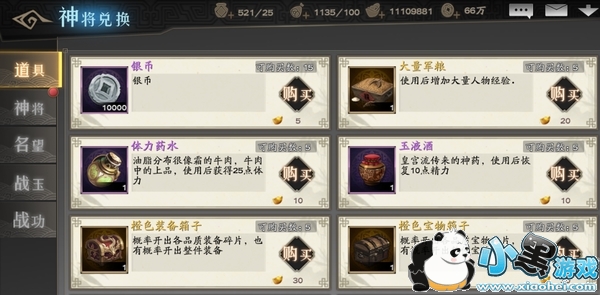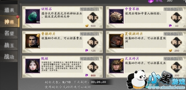 在神将商店中,可以购买培养丹等帮助武将成长的道具,同时,还可以购买武将碎片(还有可能刷出来完整的橙色武将!),神将商店每天可以免费刷新10次,赶快收集碎片,合成强力的武将吧
