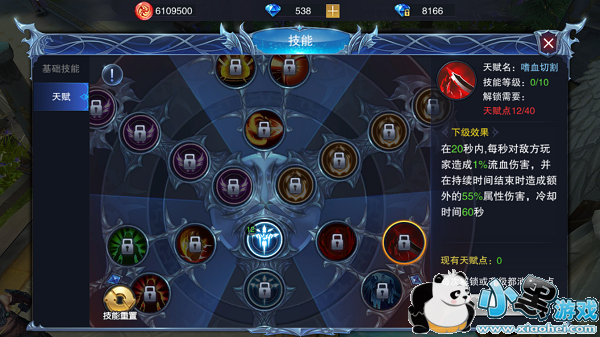 然后,当天赋点满40点时,右下方可以选择解锁的三个技能,建议优先考虑嗜血切割,此技能是pk时会对敌方玩家20秒内每秒造成流血效果,流血效果结束时还有额外的伤害加成,相比其他两个技能,这个技能的性价比是相对更高的