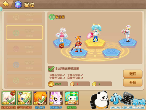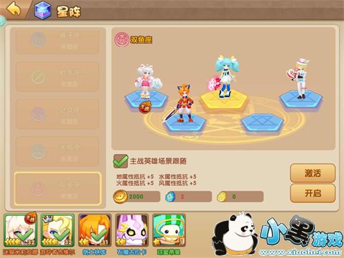 除了英雄和主角能发挥出元素力量外,部分星阵也是能增强元素属性力量的。目前开启的八个星阵中双子座和双鱼座都是能增强元素属性力量的。双子座能增强元素属性的攻击性力量,每种属性压制+5。与之相对,双鱼座属于防御星阵,能增强元素属性的防御性力量,每种属性抵抗+5。激活星阵后,结合元素属性,会大大增强游戏的策略性哦!