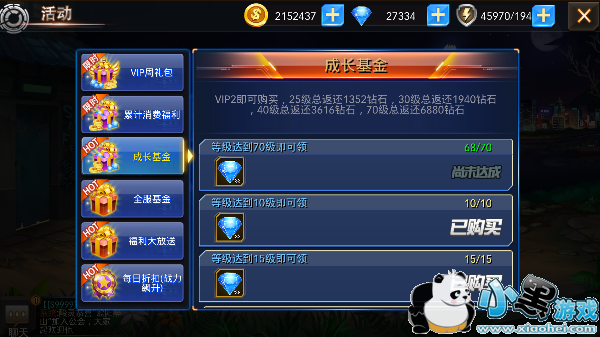 成长基金就想现实中的基金一样,每达到一定等级就会返还相应的钻石,而购买基金需要1140钻石,别看25级时返还1352钻石太少,但这种收益是长期的。当玩家达到70级时返还大量钻石,算上其他等级返还的钻石已经是一笔不小的数目,更何况游戏升级很快,完全没有后顾之忧。